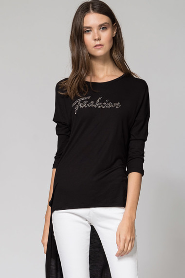 Детали одежды: принт на груди, украшенный стразами и стеклярусом